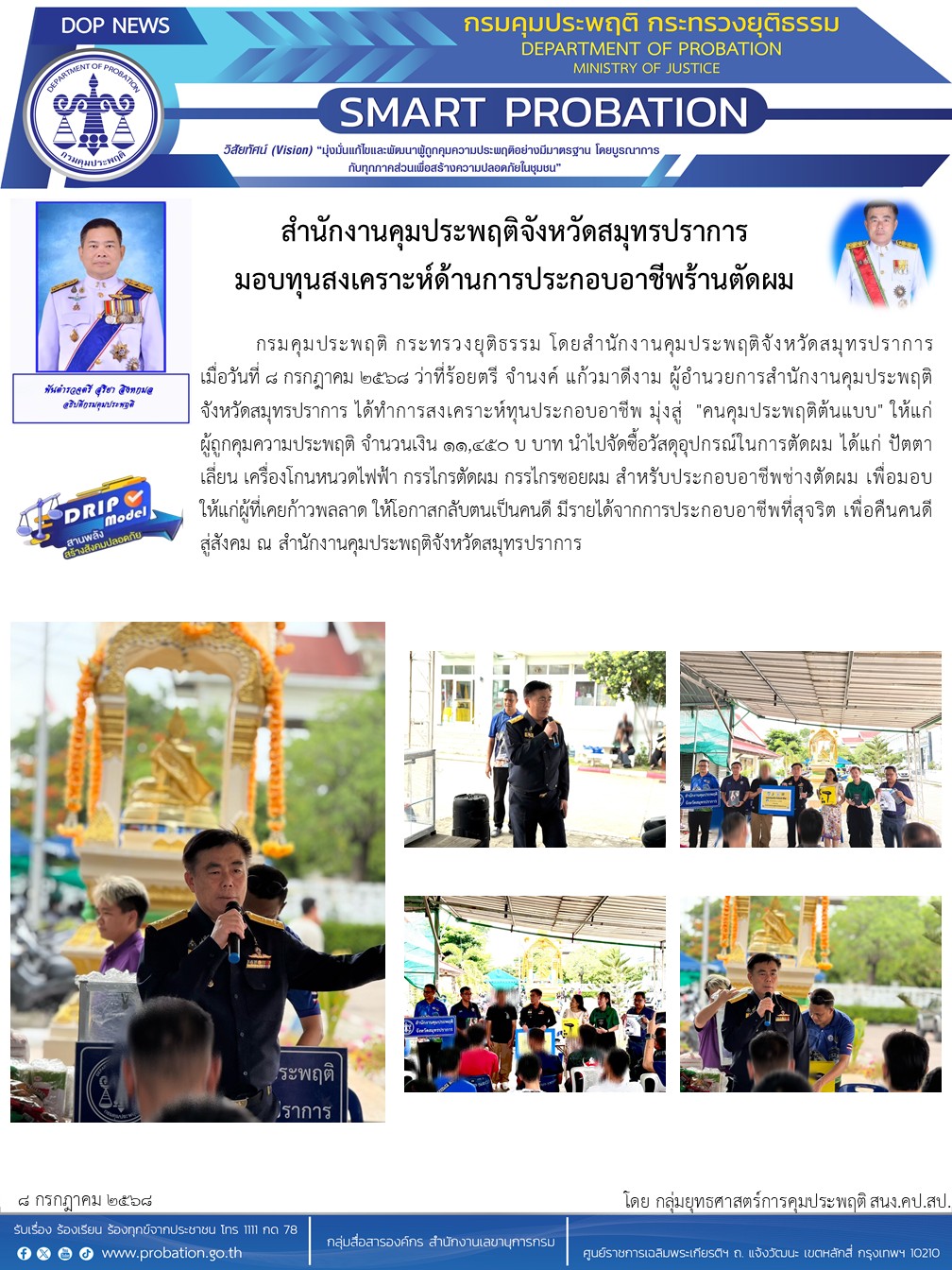 สำนักงานคุมประพฤติจังหวัดสมุทรปราการ มอบทุนสงเคราะห์ด้านการประกอบอาชีพร้านตัดผม